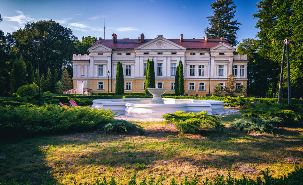 Zespół pałacowo-parkowy znajduje się 1,5km od Sasina, jego budowę rozpoczęto w 1823 roku. Ogród pałacowy zaprojektowany w stylu angielskim jest bardzo urokliwym miejscem. Zachęcamy aby wybrać się tam na spacer!